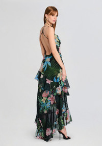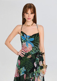 Channel your inner romance with our Samara Dress, featuring a whimsical ruffle hem, flowing silhouette, daring high slit, and captivating open back. Embrace the epitome of femininity and grace with this statement piece that promises to steal the spotlight at any occasion. Shown here in Noir Fleur Tropicale. - Runs large — those who wear Medium typically prefer a Small. - 100% Silk - Made In China - Model is 5'10" wearing size S - Style No. - SS24-8855
