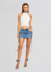 Make a statement with our Sherona Skirt, featuring hanging belts on the pockets for a touch of edgy flair. Crafted for both style and comfort, this skirt is a must-have addition to your wardrobe. Shown here in Oasis. - 100% Cotton - Made in China - Model is 5'10" wearing size 24 - Style No. - SS24-8741