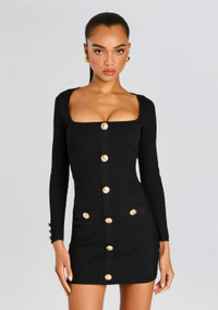 Elevate your wardrobe with the Thea Rib Knit Dress. Crafted from luxurious metallic knit fabric, this long sleeve mini dress exudes elegance and versatility. The square neck and gold buttons add a touch of sophistication, making it perfect for transitioning from day to night. - 60% Rayon, 32% Nylon, 3% Spandex, 5% Metallic - Made in China - Model is 5'10" wearing size S - Style No. - FW24-9693