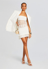 Soak up the sun in style with our dreamy Vali Dress. The strapless design, intricate pearl detailing, and the crochet pattern make it perfect for slipping on over your swimsuit. The knit fabric keeps you cool and comfortable, while the flirty ruffle hem adds a touch of playfulness. Whether you're strolling along the beach or sipping cocktails at sunset, this dress is sure to turn heads. Shown here in White. - 100% Cotton - Made in China - Model is 5'10" wearing size S - Style No. PF24-9774