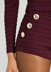 Elevate your nightlife with the luxurious Bari Bandage Knit Short. These hot shorts feature intricate button details, perfect for a sophisticated night out or romantic dinner date. Make a statement with this exclusive, high-end piece. - 60% Viscose, - 32% Nylon, 5% Metallic, - 3% Spandex - Made in China - Model is 5'10", wearing size XS - Style No. - HL25-10717
