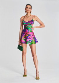 Brighten up the night in our Josefine Dress. This flirty mini dress feature a day-glo tropical print, slightly gathered bust, barely-there straps, and an a-line skirt. Shown here in Tropical Leaf. - 95% Silk, 5% Spandex - Made in China - Model is 5'11" wearing size XS - Style No. SS23-6521