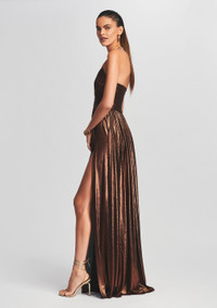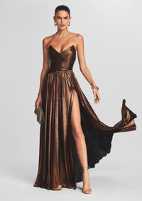 Embrace your inner goddess in our Waldorf Dress. Crafted in lustrous lame, this two-tone silhouette features ruched panels on the bodice and a floor-length skirt. The strapless neckline and a thigh-high side slit provide the silhouette with a seductively feminine feel. The style is finished with an invisible side zip closure. Shown here in Coffee Bean. - 95% Polyester, 5% Spandex - Made in China - Model size XS is 5'11" wearing size XS - Model size L is 5'11" wearing size L - Style No. FW22-5722 - Runs small. If in between sizes, size up