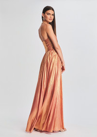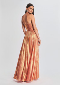 Embrace your inner goddess in our Waldorf Dress. Crafted in lustrous lame, this two-tone silhouette features ruched panels on the bodice and a floor-length skirt. The strapless neckline and a thigh-high side slit provide the silhouette with a seductively feminine feel. The style is finished with an invisible side zip closure. Shown here in Apricot. - 95% Polyester, 5% Spandex - Made in China - Model size XS is 5'11" wearing size XS - Model size L is 5'11" wearing size L - Style No. FW22-5722 - Runs small. If in between sizes, size up