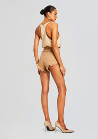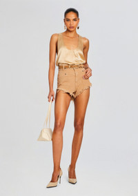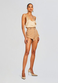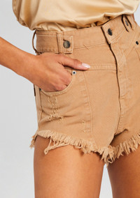 Feeling a little daring? Meet the Tessa Short: a micro frayed denim silhouette with a '70s flare. Diagonal seams with contrasting topstitching and button tabs at the waist provide the laid-back style with an elevated feel. Shown here in Camel. - 100% Cotton - Made in Italy - Model is 5'10" wearing size 25 - Style No. PF20-2820