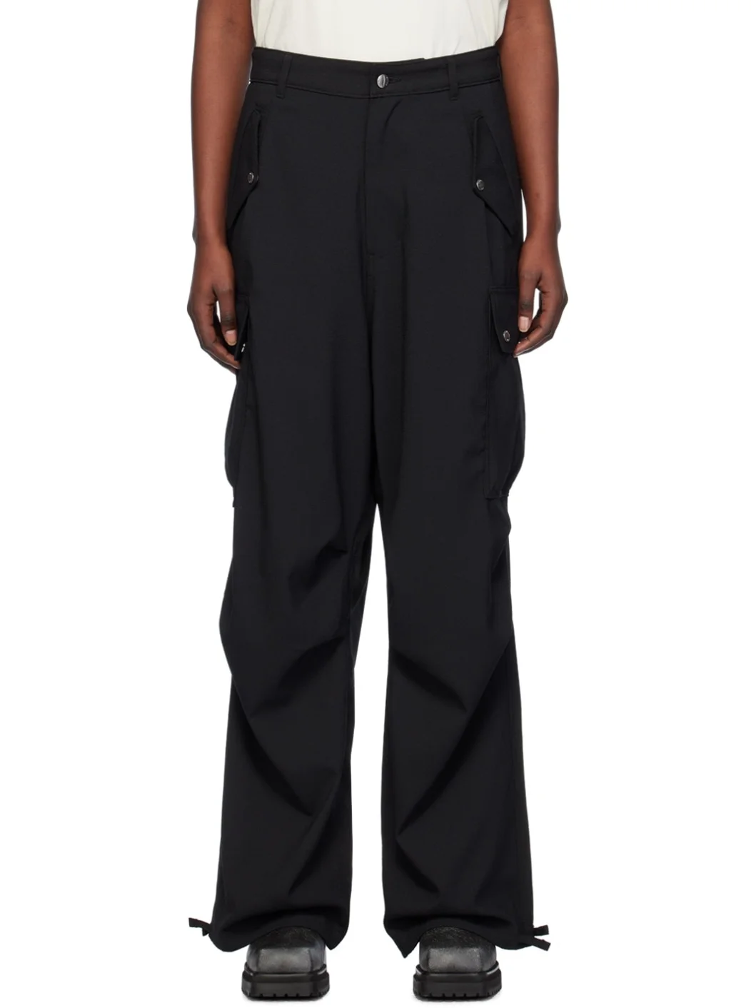 Polyester seersucker trousers. · Belt loops · Four-pocket styling · Zip-fly · Drawstring at cuffs · Ruching at seams · Cargo pocket at outseams · Logo-engraved silver-tone hardware Supplier color: Black 100% polyester. Made in United States 241923F087000