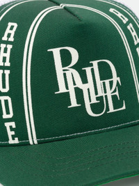 Heavyweight vintage cap with Rhude Scramble Logo and logo designs printed on the front. Back panel is constructed with a breathable mesh material. Features an adjustable snap strap at the back, so you can adjust the fit to your preference, and green under brim. 100% POLY/100% COTTON