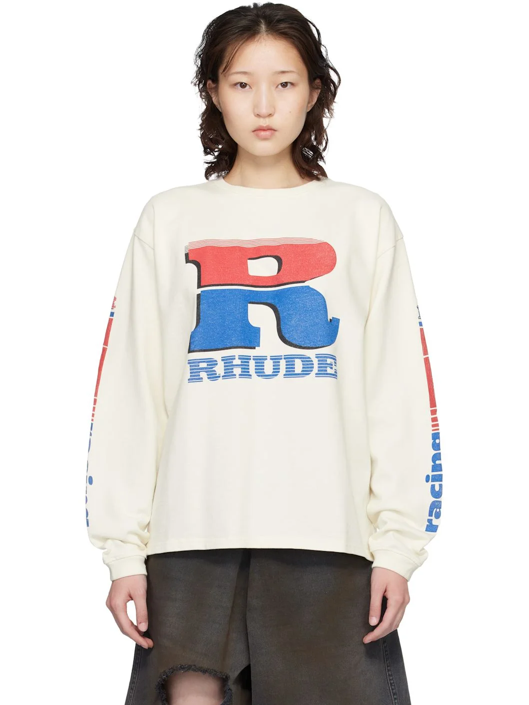 Cotton jersey T-shirt. · Rib-knit crewneck and cuffs · Logo printed at front · Dropped shoulders · Stripes and printed text at sleeves Supplier color: Vintage white 100% cotton. Made in United States 261923F110000