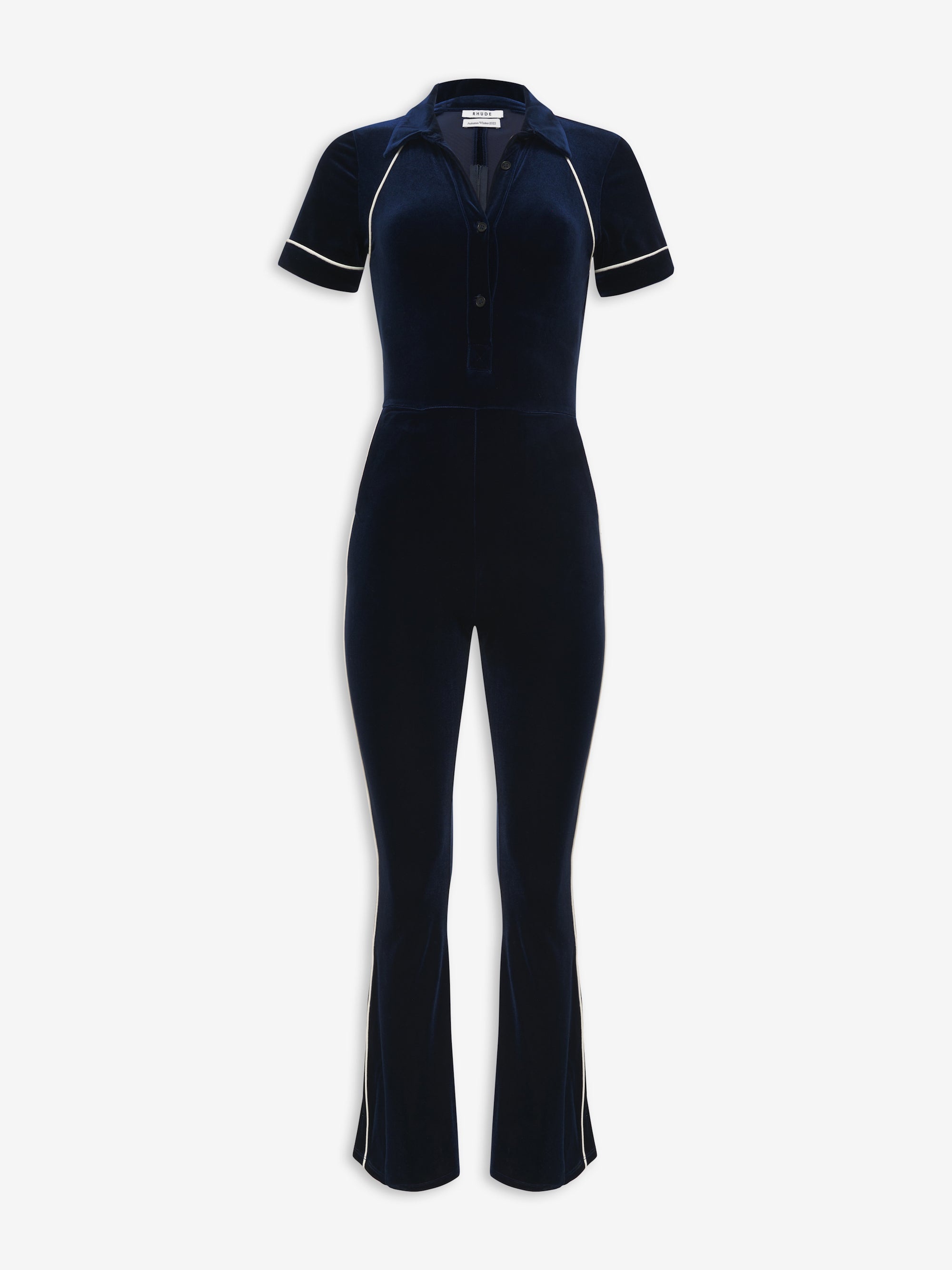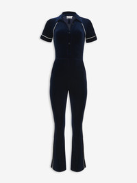 SHORT SLEEVE VELVET JUMPSUIT WITH A SLIM SILHOUETTE, FEATURING A POINT COLLAR, BOOTCUT LEGS, FRONT BUTTON CLOSURES AND AN OPEN BACK WITH ZIP CLOSURE.SEE SIZING BELOW FOR MEASUREMENTS CARE COMPOSITION: VELOUR - 90% POLYESTER 10% POLYURETHANE DRY CLEAN ONLY FITS TRUE TO SIZE
