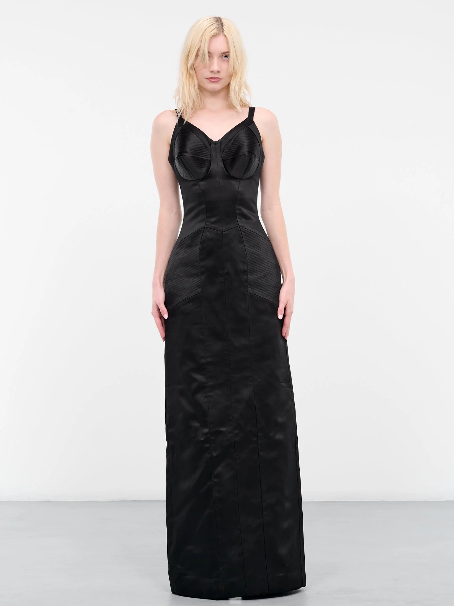 RICHARD QUINN black dress, topstitched design, sweetheart neckline, cone bra, back zip closure, center vent, maxi length, fitted. UK Sizing Model is 5'6" wearing size 10. Bust: 32" Waist: 24" Hips: 35"