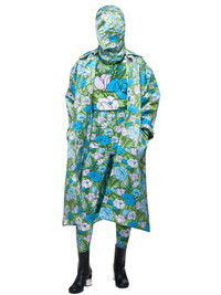 Richard Quinn polyester coat in green/blue, all-over floral pattern, spread collar and waist belt outlined with Swarovski crystals, patch hand pockets, strap around sleeves, straight/finished hem, tonal stitching. Made in England. Composition - 100% Polyester Model is 5ft 8” and wearing a size 10. Bust: 31” Waist: 24” Hip: 35”
