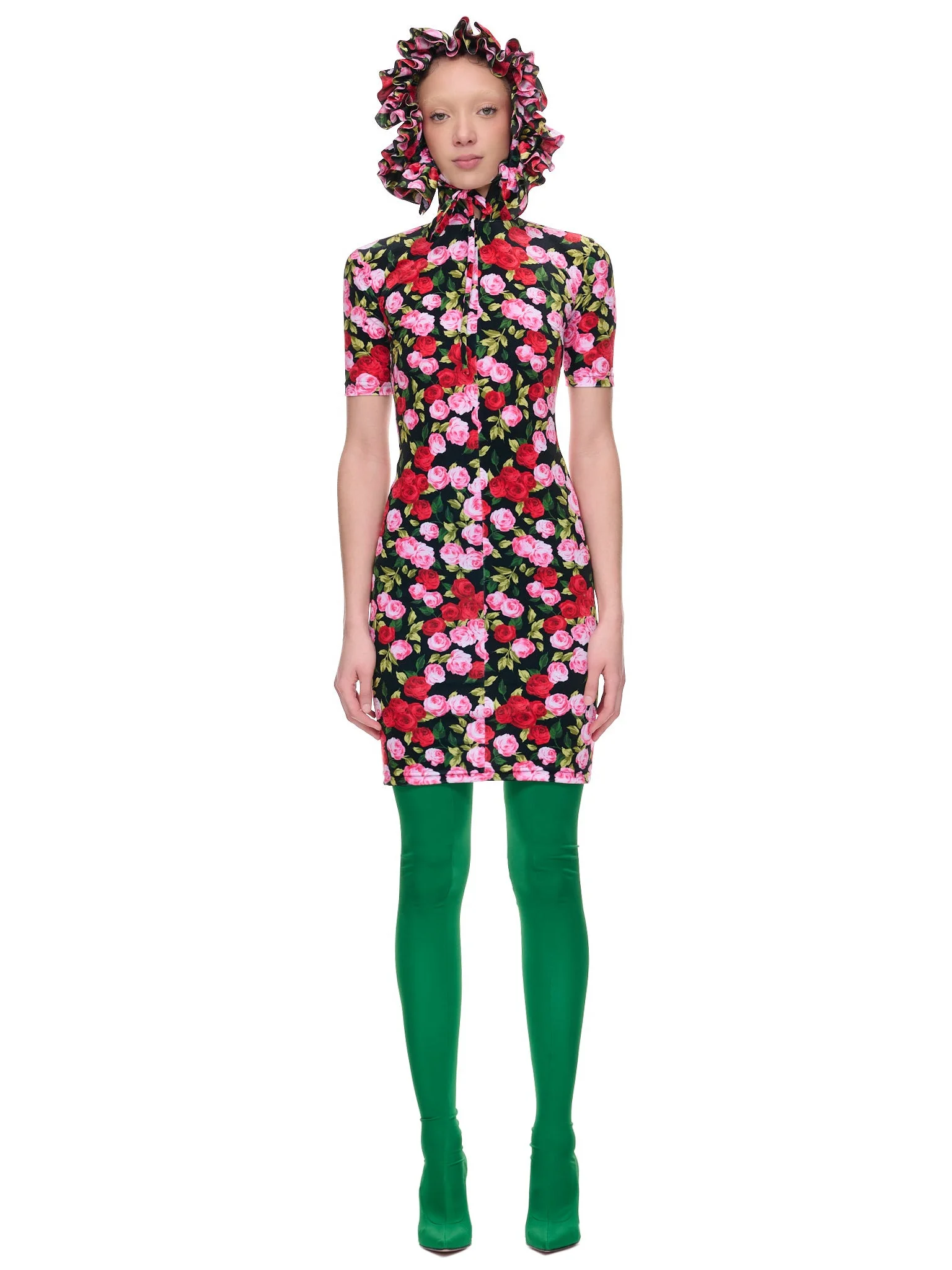 RICHARD QUINN dress in red, rose print, adjustable hooded collar with ruffle trim, concealed zip closure, short sleeves, mini length, form fitting. UK Sizing Model is 5'9.5" wearing size 8. Bust: 32" Waist: 26" Hip: 35”