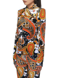 Richard Quinn velour top in multicolor, all-over paisley pattern, split turtleneck collar, shoulder padding, long sleeves, straight/finished hem, tonal stitching. Made in England. Composition - 90% Polyester, 10% Spandex Model is 5ft 8” and wearing a size 8. Bust: 31” Waist: 24” Hip: 35”