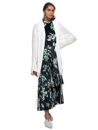 Richard Quinn pleated skirt in black, all-over daisy pattern, stiff waistband with side zip closure, double layered skirt with both panels attached at the waist, straight/ finished hem, tonal stitching. Made in England. Composition - 100% Polyester Model is 5ft 8” and wearing a size 8. Bust: 32” Waist: 26” Hip: 36"
