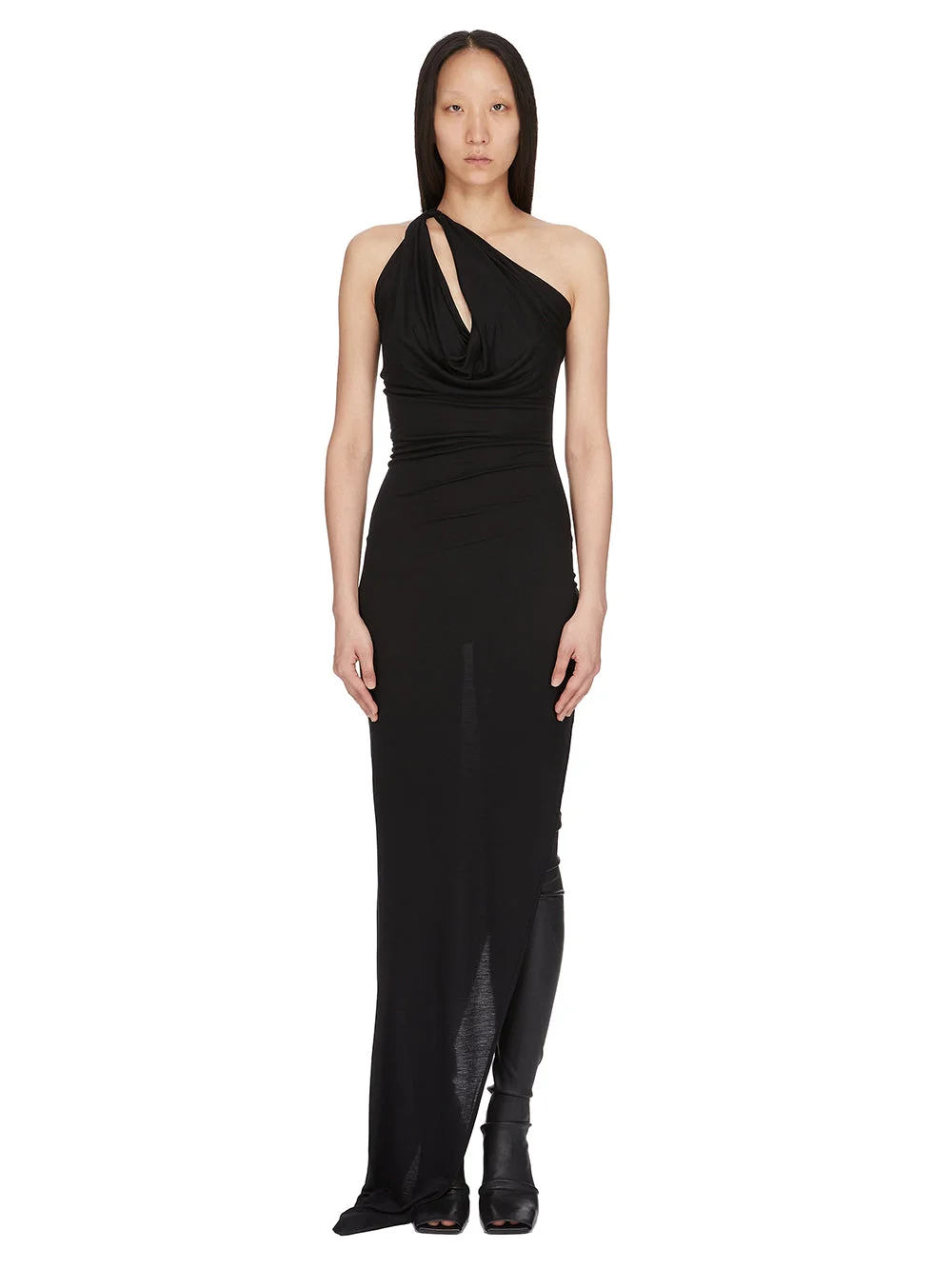 RICK OWENS SS26 TEMPLE AALIYAH GOWN IN BLACK FLUID VISCOSE JERSEY THIS AALIYAH GOWN TRAILS FLOOR LENGTH. IT HAS AN ASYMMETRICAL TOP, DRAPING ACROSS THE BODY TO THE RIGHT SHOULDER, WITH AN OPENING, EXPOSING THE CHEST. IT FEATURES A TWIST ON THE RIGHT SHOULDER AND DRAPES ACROSS THE BODY, GATHERING INTO THE LEFT HIP AND DESCENDS INTO A SKIRT WITH A HIGH SPLIT THAT TAPERS TO THE FLOOR. THIS MEDIUMWEIGHT AND FLUID VISCOSE JERSEY IS BRUSHED WITH A SOFT HANDFEEL. THIS JERSEY IS MADE FROM FSC® - CERTIFIED (FSC - C162846) VISCOSE WHICH ENSURES THAT THE FIBERS ARE PRODUCED FROM RESPONSIBLY MANAGED SOURCES AND NO DEFORESTATION OCCURS. COLOR: BLACK MATERIAL:100% VISCOSE MODEL IS 181CM TALL MODEL WEARS SIZE 40