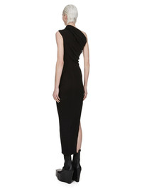 RICK OWENS SS25 HOLLYWOOD THENA DRESS IN BLACK RIBBED KNIT THIS ATHENA DRESS IS ANKLE LENGTH WITH A CLOSE TO THE BODY FIT. IT IS SLEEVELESS AND HAS AN ASYMMETRICAL DRAPED NECKLINE AND ONE LEFT SHOULDER THAT CREATES A SLIGHT DRAPING ACROSS THE FRONT AND BACK. IT FEATURES A SPLIT ON THE RIGHT SIDE, TO ABOVE THE KNEE, AND A SIGNATURE KNIT LINE RUNNING DOWN THE CENTER BACK SPINE THIS LIGHTWEIGHT AND CLASSIC RIBBED WOOL KNIT HAS A SOFT HANDFEEL. COLOR: BLACK MATERIAL: 100% NEW WOOL MODEL IS 181CM TALL MODEL WEARS SIZE S