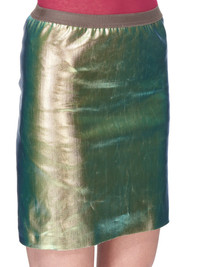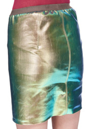 RICK OWENS SS23 EDFU PLAIN MINI IN IRIDESCENT STRETCH DENIM THIS PLAIN MINI SKIRT IS MID-THIGH LENGTH AND FEATURES AN ELASTICATED WAIST AND CENTRE BACK SEAM THIS STRETCH DENIM IS TREATED WITH A WATER-BASED MULTI-TONAL IRIDESCENT METALLIC FINISH - COLOR: IRIDESCENT - MATERIAL: 91% COTTON + 6% ELASTOMULTIESTER + 3% RUBBER - MODEL IS WEARING SIZE 40 - MODEL IS 181 CM TALL