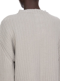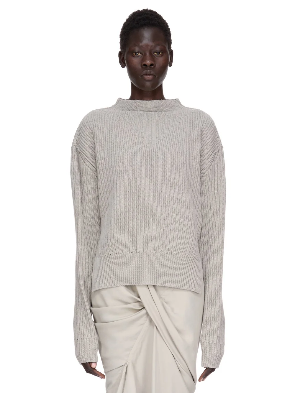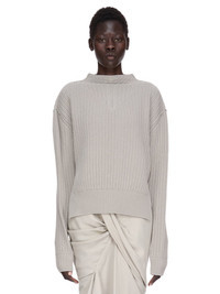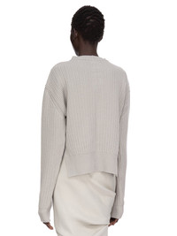 RICK OWENS FW25 CONCORDIANS HEADON PULL IN PEARL BOILED RECYCLED CASHMERE KNIT THIS HEADON PULL IS ABOVE HIP LENGTH WITH LONG SLEEVES. IT HAS A WIDE LUPETTO NECK, LEVEL SHOULDER SEAMS AND A KNIT LINE RUNNING DOWN THE CENTRE FRONT AND BACK THIS SOFT CASHMERE KNIT IS MADE FROM RECYCLED YARNS COLOR: PEARL MATERIAL: 97% CASHMERE 3% WOOL MODEL IS 181CM TALL MODEL WEARS SIZE S