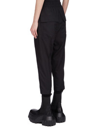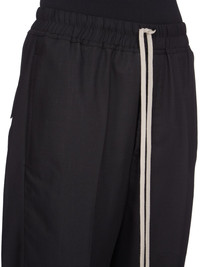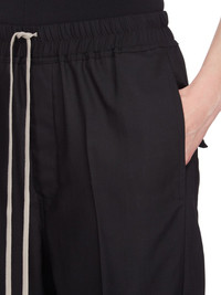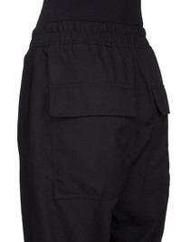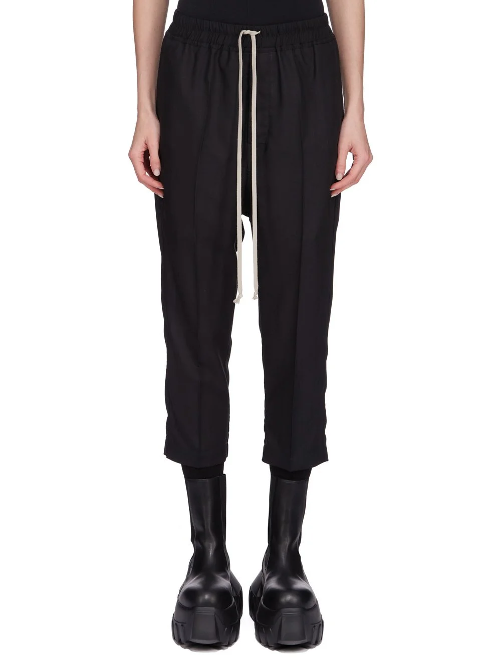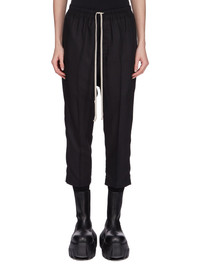 RICK OWENS SS25 HOLLYWOOD DRAWSTRING ASTAIRES CROPPED IN WOOL GAUZE THESE DRAWSTRING ASTAIRES CROPPED ARE ABOVE-ANKLE LENGTH, HAVE A SLIGHTLY DROPPED CROTCH AND AN ELASTICIZED WAIST WITH DRAWSTRING. THEY HAVE SIDE POCKETS AND BACK POCKETS WITH FLAPS, AND HAVE PRESSED CREASES ON THE FRONT AND BACK LEG THIS LIGHTWEIGHT AND SEMI TRANSPARENT WOOL GAUZE HAS A SOFT HANDFEEL. IT IS WOVEN IN THE BIELLA REGION OF ITALY RENOWNED FOR ITS LONG TRADITION OF TAILORED WOOL THIS FABRIC IS MADE FROM ZQ CERTIFIED VIRGIN WOOL WHICH ENSURES A HIGH STANDARD IN ANIMAL WELFARE, ENVIRONMENTAL SUSTAINABILITY AND SOCIAL RESPONSIBILITY. EACH BALE OF WOOL IS TRACEABLE BACK TO ITS SOURCE COLOR: BLACK MATERIAL: 100% NEW WOOL MODEL IS 181CM TALL MODEL WEARS SIZE 40