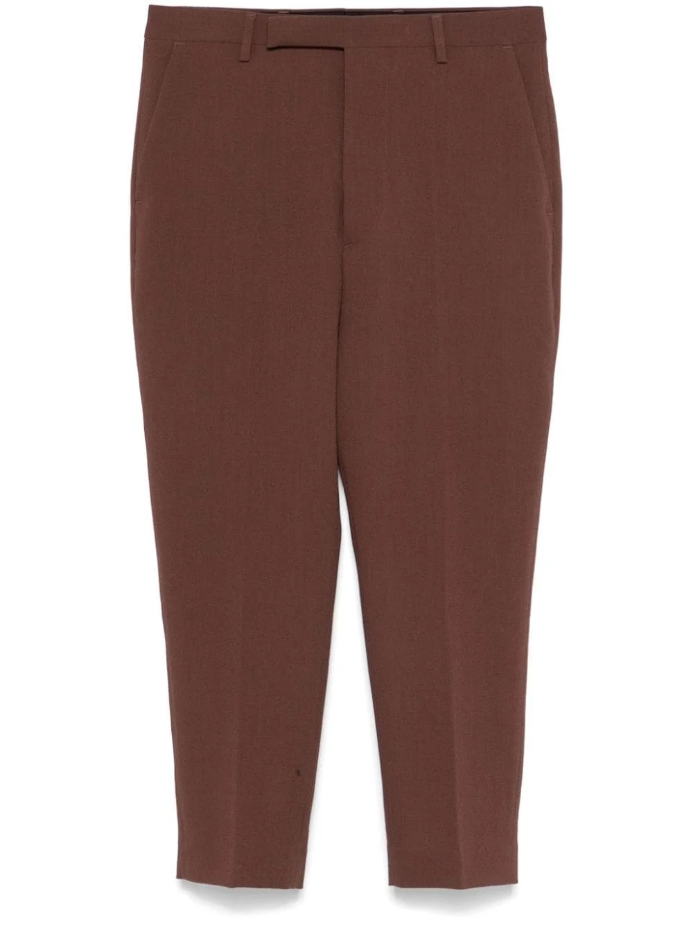 Astaires trousers Highlights - Chocolate brown - Virgin wool - Interwoven design - Concealed front button, hook and zip fastening - Belt loops - Pressed crease - Two diagonal pockets to the sides - Two rear button-fastening pockets - Tapered leg - Cropped Made In Italy Composition Outer: Buffalo Horn 100%, RWS Virgin Wool 100% Lining: Cupro 100% SIZE & FIT Model measurements Height 5 ft 11 in(1.8 m) Bust/Chest 33.07 in(84 cm) Hips 37.4 in(95 cm) Waist 25.19 in(64 cm) FittingInformation Designed with a dropped crotch, these trousers allow for a close fit at the waist with a loose and relaxed fit through the leg Cropped in length Made from a midweight non-stretch fabric
