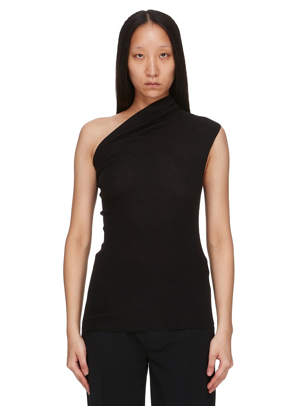 RICK OWENS SS25 HOLLYWOOD ATHENA IN BLACK RIBBED KNIT THIS ATHENA IS A HIP LENGTH TOP WITH A CLOSE TO THE BODY FIT. IT IS SLEEVELESS WITH AN ASYMMETRICAL DRAPED NECKLINE AND ONE LEFT SHOULDER THAT CREATES A SLIGHT DRAPING ACROSS THE FRONT AND BACK. IT FEATURES A SIGNATURE KNIT LINE RUNNING DOWN THE CENTER BACK SPINE THIS LIGHTWEIGHT AND CLASSIC RIBBED WOOL KNIT HAS A SOFT HANDFEEL. COLOR: BLACK MATERIAL: 100% NEW WOOL MODEL IS 181CM TALL MODEL WEARS SIZE S