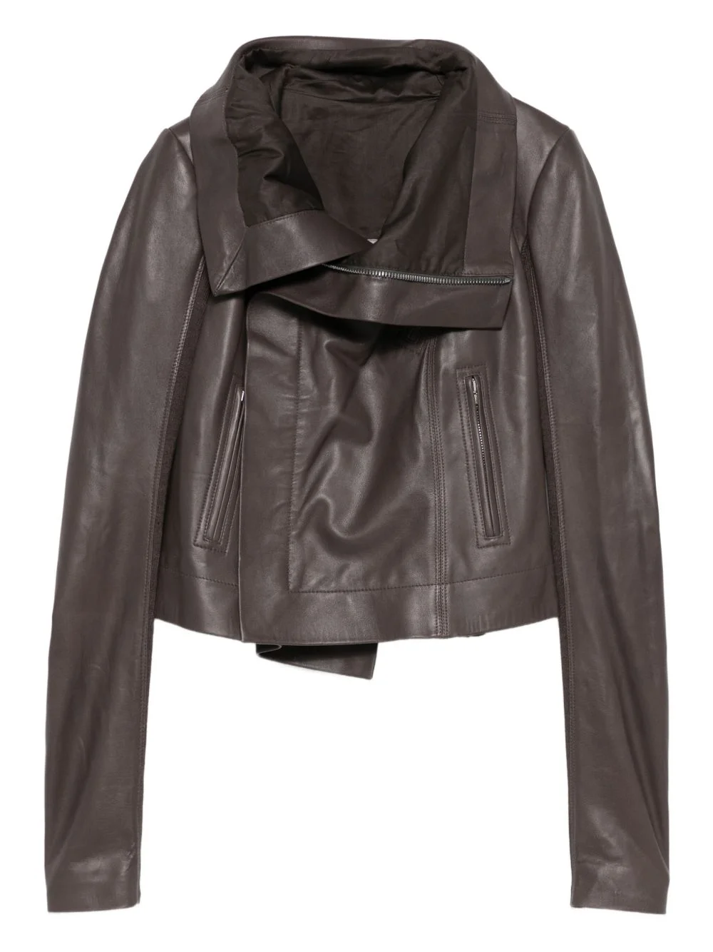 asymmetric leather coat Highlights - Dark brown - Asymmetrical zip fastening - High collar - Zip pockets Made in Italy Composition Lamb Skin 100% SIZE & FIT Model measurements Height 5 ft 9 in(1.75 m) Bust/Chest 34.64 in(88 cm) Hips 36.61 in(93 cm) Waist 26.37 in(67 cm) Washing instructions Read Manufacturer Guidelines
