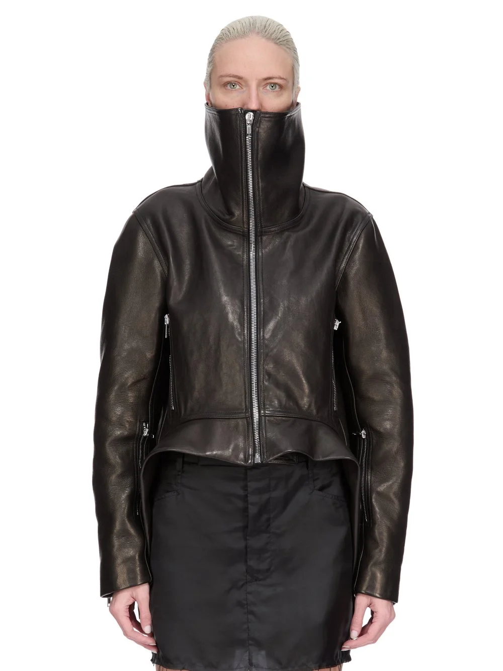 RICK OWENS FW25 CONCORDIANS EXPLODER JKT IN BLACK VEG NAPPA LAMB THIS EXPLODER JKT IS BELOW WAIST LENGTH IN FRONT AND LONGER IN THE BACK. IT HAS LONG SLEEVES WITH ZIPPERED WRISTS AND A CENTRE FRONT ZIPPER THAT CLOSES ALL THE WAY UP OVER THE NOSE. IT CAN BE WORN CLOSED OR OPEN, CREATING A WIDE LAPEL. IT FEATURES A CURVED, SLIGHTLY LIFTED, FRONT HEM THAT ENDS IN POINTS AT THE SIDES AND HAS TWO FRONT SIDE ZIPPERED POCKETS ON THE LEATHER SIDE. THIS VERSION HAS SOFT LONG, CURLY FUR ON THE INSIDE, AND SIDE SEAMS, AND IS COMPLETELY REVERSIBLE THIS MEDIUMWEIGHT LAMB LEATHER IS VEG TANNED AND FINISHED USING NATURAL WAXES AND ANILINE WHICH MAKES A SUPPLE HANDFEEL. BECAUSE THIS SKIN IS NAKED, NOT FINISHED USING ANY PIGMENTS COVERING THE SKIN, NATURAL MARKINGS AND SHADINGS ARE VISIBLE WHICH MAKES EACH SKIN AND PRODUCT UNIQUE VEG TANNING MEANS ONLY VEGETAL AND NATURAL TANNINS WERE USED IN THE PROCESS OF TANNING AND PRESERVING THIS LEATHER COLOR: BLACK MATERIAL: 100% LAMB LEATHER MODEL IS 181CM TALL MODEL WEARS SIZE 40