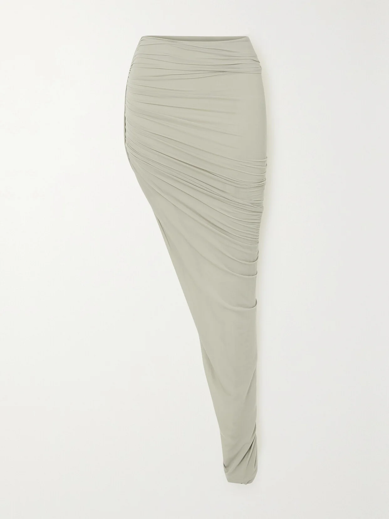 Asymmetry is an underlying theme that runs through Rick Owen's collections. Made from soft stretch-jersey, this skirt has a dramatic, sloping hemline and ripples with ruching. Wear yours with sandals, mules or boots.