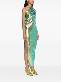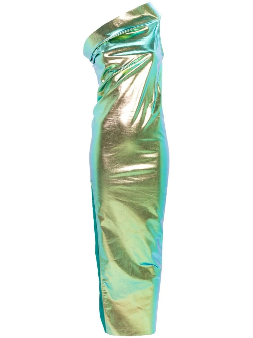 Athena iridescent-effect one-shoulder gown Inspired by the goddess Athena, Rick Owens presents this midi dress of the same name. Delivered in an iridescent green tone, the one-shoulder silhouette nods to the Grecian influence. Highlights - Green - Iridescent effect - One-shoulder - Sleeveless - Asymmetric neck - Raw-cut finish - Draped detailing - Tapered skirt - Thigh-high side slit - Cotton lining Made in Italy Composition Cotton 91%, Elastomultiester 6%, Rubber 3% SIZE & FIT Model measurements Height 5 ft 9 in(1.76 m) Bust/Chest 31.1 in(79 cm) Hips 36.61 in(93 cm) Waist 24.8 in(63 cm) FittingInformation Designed for a slim fit that sits just away from the body offering a close yet comfortable fit Made from a midweight stretch fabric, this piece offers elasticity and flexibility when worn This piece fits true to size – take your usual size