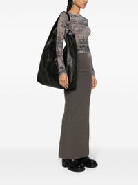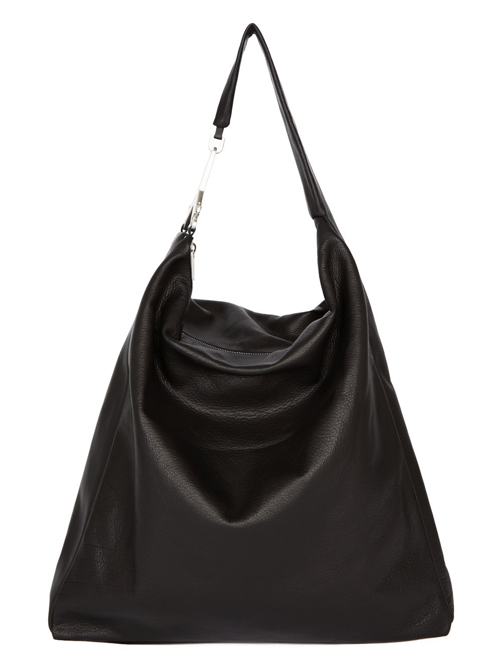 RICK OWENS SS24 LIDO RUNWAY CERBERUS BAG IN BLACK SOFT GRAIN COW LEATHER THIS CERBERUS BAG IS A LARGE SOFT A-SHAPED BAG THAT SLOUCHES IN THE MIDDLE. IT CURVES OVER TO CREATE A STRAP THAT SECURES WITH A CERBERUS TRIPLE-SIDED SNAP HOOK THAT IS ENGRAVED WITH THE RICK OWENS LOGO.THE BAG OPENS WITH A TOP ZIPPER, HAS AN INNER POUCH POCKET AND A FLAT POCKET WITH SIGNATURE U-SHAPED STITCHING DETAIL VISIBLE ON THE REAR EXTERIOR THIS MEDIUMWEIGHT COW LEATHER HAS A SUBTLE GRAIN TEXTURE AND NATURAL HANDFEEL. TANNED IN THE VENETO AREA OF ITALY, THIS LEATHER IS TUMBLED MULTIPLE TIMES IN A LARGE DRUM IN ORDER TO BRING OUT THE NATURAL GRAIN TEXTURE OF THE SKIN. THE LEATHER IS FINISHED WITH ANILINE AND AIR-DRIED IN ORDER TO ACHIEVE THE NATURAL AND WAXY HANDFEEL. THIS TANNERY IS LWG CERTIFIED WITH A SILVER RATING. - COLOR: BLACK - MATERIAL: 100% COW LEATHER . - WIDTH 46CM / HEIGHT 77CM / DEPTH 12CM