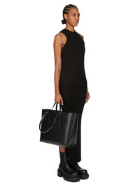 RICK OWENS SS25 HOLLYWOOD SHOPPER IN BLACK SPALLA LUX THIS SHOPPER IS A HORIZONTAL RECTANGULAR TOTE BAG WITH AN OPEN TOP. IT HAS TWO LONG HANDLES INTENDED FOR A SHOULDER CARRY AND TWO SHORT HAND CARRY HANDLES. IT HAS AN INNER ZIPPERED POCKET AND AN INNER FLAT POCKET WITH SIGNATURE U-SHAPED STITCHING DETAIL VISIBLE ON THE FRONT. IT IS EMBOSSED WITH THE RICK OWENS LOGO THIS HEAVYWEIGHT COW LEATHER IS VEG TANNED AND HAS A FLAT AND SHINY FINISH. THE SKINS ARE TANNED AND FINISHED WITH ANALINE AND THEN HEAT PRESSED TO ACHIEVE THE FINAL SHINE. BECAUSE THIS SKIN IS NAKED, NOT FINISHED USING ANY PIGMENTS COVERING THE SKIN, NATURAL MARKINGS AND SHADINGS ARE VISIBLE WHICH MAKES EACH SKIN AND PRODUCT UNIQUE. VEG TANNING MEANS ONLY VEGETAL AND NATURAL TANNINS WERE USED IN THE PROCESS OF TANNING AND PRESERVING THIS LEATHER. COLOR: BLACK MATERIAL: 100% COW LEATHER 100% BULL LEATHER WIDTH 50CM / HEIGHT 32CM / DEPTH 15CM