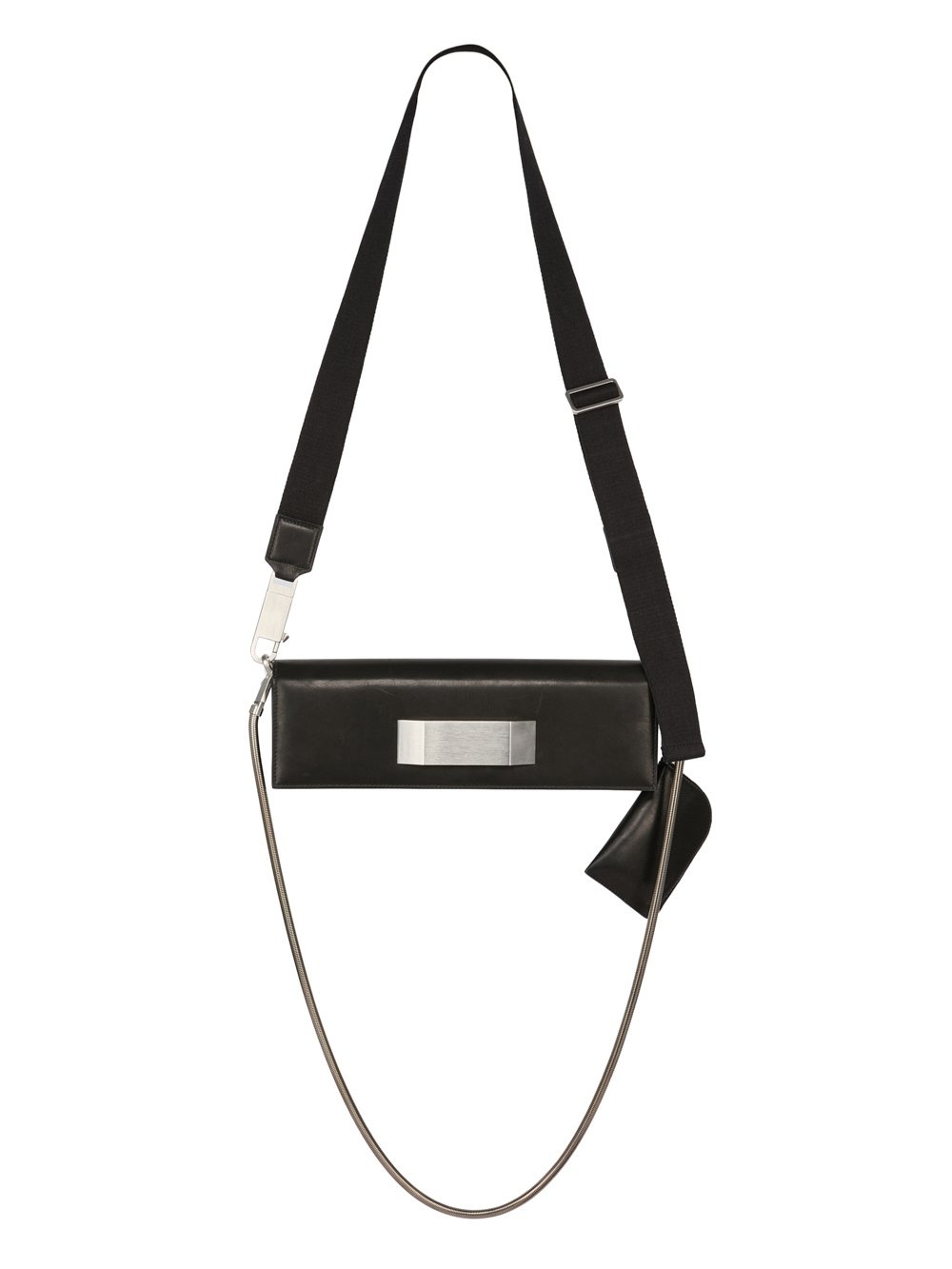 RICK OWENS SS25 HOLLYWOOD RUNWAY GRIFFIN BAGUETTE IN BLACK BUTTER CALF LEATHER THIS BAGUETTE IS A STRUCTURED, ELONGATED, RECTANGULAR SHAPE BAG. IT HAS A FLAP WITH A PALLADIUM INDENTED EASY-GRIP BEVEL AND MAGNETIC CLOSURE. IT HAS ONE MAIN INNER POCKET WITH FLAT BACK POCKET, AND A SECOND SLIM POCKET WITH 2 CARD SLOTS. IT FEATURES A LONG THIN LEATHER STRAP WITH A PALLADIUM TONE BRASS HOOK WHICH TIES ON ONE SIDE, OR CAN BE DETACHED TO CREATE A CLUTCH. IT FEATURES AN ADJUSTABLE COTTON WEBBING STRAP AND A SNAKE CHAIN STRAP, EACH WITH TWO PALLADIUM TONE BRASS HOOKS THE STRAPS CAN BE DETACHED TO CREATE A CLUTCH. THIS VERSION ALSO FEATURES A RECTANGULAR HOOK WALLET, WITH ONE ROUNDED CORNER AND A ZIPPER CLOSURE. IT ATTACHES TO THE MINI GRIFFIN BY A CHAIN WITH A SMALL PALLADIUM TONE BRASS HOOK THIS LIGHTWEIGHT FULL GRAIN CALF LEATHER IS FINISHED ONLY USING ANALINE AND NATURAL OILS IN ORDER TO ACHIEVE ITS BUTTERY AND SEMI SHINY SURFACE COLOR: BLACK MATERIAL: 100% CALF LEATHER SHOULDER STRAP 100% COTTON WIDTH 33CM / HEIGHT 11,5CM / DEPTH 4CM THIS ITEM IS SOLD AS A SET THAT INCLUDES : WEBBING STRAP - MINIMUM LENGTH 36CM / MAXIMUM LENGTH 141CM SNAKE CHAIN - TOTAL LENGTH 56CM HOOK WALLET - WIDTH 7,5CM / HEIGHT 12CM / DEPTH 1CM