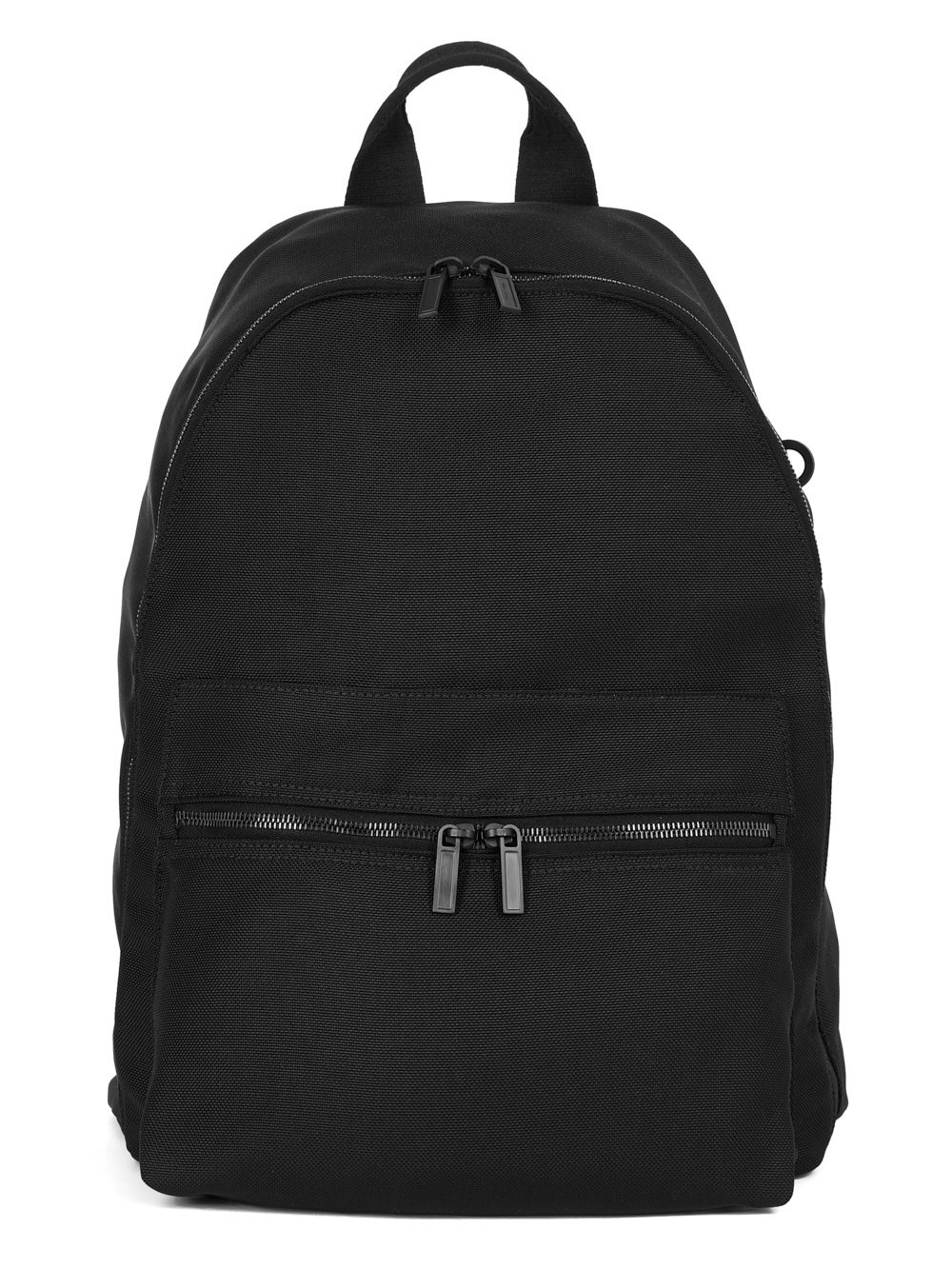 RICK OWENS SS25 HOLLYWOOD BACKPACK IN BLACK/BLACK HEAVY CORDURA THIS BACKPACK IS A CLASSIC SHAPE WITH A SQUARE BOTTOM AND A ROUNDED TOP. IT HAS ONE LARGE MAIN DOUBLE ZIPPERED POCKET WITH A SECOND FRONT ZIPPERED POUCH IT HAS A TOP HANDLE AND TWO ADJUSTABLE LEATHER AND COTTON WEBBING CARRY STRAPS. THE INTERNAL, PADDED POCKET CAN FIT UP TO A 16” COMPUTER. THE BACK IS PADDED FOR EXTRA COMFORT AND SIGNATURE STITCHED DOUBLE TAG LABEL THIS HEAVY CORDURA TYPE NYLON HAS A DISTINCT CANVAS PATTERN AND RIGID HANDFEEL. IT WAS INSPIRED BY UTILITARIAN FABRICS AND IS HIGHLY RESISTANT AND DURABLE. THIS FABRIC WAS WOVEN BY BONOTTO, A 4TH GENERATION TEXTILE MILL FOUNDED IN 1912 SITUATED JUST BELOW THE PREALPS IN VENETO, ITALY. COLOR: BLACK/BLACK MATERIAL: 100% NYLON RIBBONS 100% COTTON WIDTH 34CM / HEIGHT 44CM / DEPTH 23CM