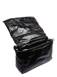 RICK OWENS SS25 HOLLYWOOD BIG PILLOW GRIFFIN IN BLACK GLOSSY LAMB LEATHER THIS BIG PILLOW GRIFFIN IS A LARGE RECTANGULAR, SOFT PADDED BAG, WITH A FRONT FLAP, WITH A PALLADIUM INDENTED EASY-GRIP BEVEL AND MAGNETIC CLOSURE. IT HAS ONE PONTICELLO D-LOOP ON FRONT, AN INNER POCKET WITH 9 CARD SLOTS AND A SECOND INNER ZIPPERED POCKET. IT FEATURES A LONG THIN LEATHER STRAP WITH A PALLADIUM TONE BRASS HOOK WHICH TIES ON ONE SIDE, OR CAN BE DETACHED TO CREATE A CLUTCH THIS LIGHTWEIGHT LAMB LEATHER IS FINISHED WITH ANALINE AND A WATER BASED GLOSSY PATENT FINISH. THIS LEATHER HAS A SOFT HAND FEEL. COLOR: BLACK MATERIAL: 100% LAMB LEATHER PADDING 90% POLYESTER + + 10% ACRYLIC WIDTH 32CM / HEIGHT 22CM / DEPTH 10CM