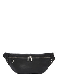 RICK OWENS FW25 CONCORDIANS BUMBAG IN BLACK SOFT BUFFALO THIS BUMBAG IS A LARGE BEVEL SHAPED FANNY PACK WITH ONE FRONT, DOUBLE ZIPPERED POCKET AND A SECOND ZIP POCKET ON BACK WITH SIGNATURE U-SHAPED STITCHING DETAIL VISIBLE ON THE BACK. IT FEATURES AN ADJUSTABLE COTTON WEBBING STRAP WITH A PALLADIUM TONE BRASS SNAP HOOK, SIDE RIVETS AND METAL D-RING DETAIL. THIS BUMBAG CAN BE WORN AROUND THE HIPS OR ACROSS THE BODY. THIS MEDIUMWEIGHT LEATHER IS MADE FROM ITALIAN BUFALO HIDES AND FINISHED USING ONLY ANALINE TO KEEP THE LEATHER AS NATURAL AS POSSIBLE. THE GRAINY TEXTURE IS ACHIEVED BY TUMBLING THE SKINS MULTIPLE TIMES. THIS TANNERY IS LWG CERTIFIED WITH A GOLD RATING. COLOR: BLACK MATERIAL: 100% BUFFALO LEATHER RIBBONS 100% COTTON IT MEASURES 49CM X 16CM X 6CM