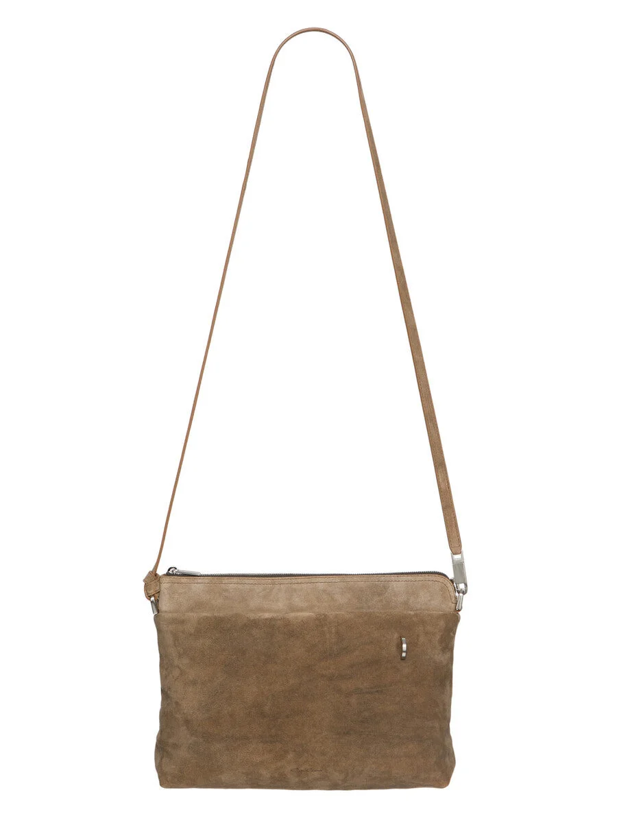 RICK OWENS SS26 TEMPLE ADRI IN BROWN SUMI SUEDE LEATHER THIS ADRI IS A RECTANGULAR POUCH WITH TOP ZIPPER CLOSURE, A PONTICELLO D-LOOP DETAIL AND A LONG, THIN, ADJUSTABLE LEATHER STRAP, WITH SMALL PALLADIUM TONE BRASS SNAP HOOKS AND D-RINGS. THIS MEDIUMWEGHT CALF SUEDE LEATHER IS OVERDYED WITH A BLACK JAPANESE PIGMENT CALLED SUMI THAT IS MADE FROM CARBON POWDER AND TRADITIONALLY USED IN CALIGRAPHY. THE SKINS ARE THEN WASHED TO CREATE THE UNEVEN DYE EFFECT. IT HAS A NATURAL AND WAXY HANDFEEL ACHIEVED BY DRUMMING THE SKINS WITH WAX. SINCE THE SUMI PIGMENT USED TO DYE THIS LEATHER IS NATURAL, SHADINGS AND COLOR VARIATIONS WILL BE PRESENT. THE COLOR WILL CONTINUE TO EVOLVE AND CHANGE WITH WEAR AND AS IT GET EXPOSED TO LIGHT AND HUMIDITY. THIS TANNERY IS LWG CERTIFIED WITH A GOLD RATING. COLOR: SUMI BROWN MATERIAL:100% CALF LEATHER PADDING 100% RECYCLED POLYESTER WIDTH 29CM HEIGHT 21CM DEPTH 9CM