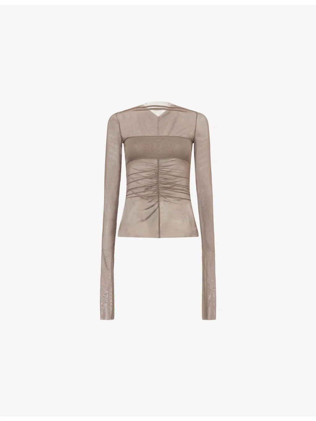 PRODUCT DETAILS - Rick Owens mesh top - 93% polyamide, 7% elastane; contrast 100% cotton - Fitted, round neck, long sleeves, cotton bandeau insert, ruched sheer mesh, raw edge trims - Hand wash - Made in Italy - True to size - Model is 5ft 10in/1.78m and wears a size UK 8 - Lightweight, slight stretch Ref: R04618951