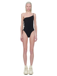RICK OWENS SS23 EDFU TACO BATHER IN BLACK RECYCLED NYLON SWIMWEAR JERSEY THIS TACO BATHER IS A SKIN TIGHT ONE PIECE SWIMSUIT. IT HAS AN ASYMMETRICAL NECKLINE WITH ONE THIN SHOULDER STRAP, AND FEATURES AN OPEN RIGHT SIDE BODY THAT CLOSES WITH THIN ADJUSTABLE TIES THIS MEDIUMWEIGHT CLASSIC SPORT JERSEY HAS COMFORT STRETCH, A MATTE FINISH AND IS PRODUCED ESPECIALLY FOR SWIMWEAR WITH HIGH UV AND CHLORINE RESISTANCE. WE CHOSE TO MAKE THIS PRODUCT FROM CERTIFIED RECYCLED POLYAMIDE BECAUSE IT ENSURES A REDUCTION IN WATER CONSUMPTION, EMISSIONS AND HAZARDOUS WASTE, LESSENING THE DEPENDENCE ON NON-RENEWABLE RESOURCES. - COLOR: BLACK - MATERIAL: 73% NYLON + 27% ELASTANE - MODEL IS WEARING SIZE 40 - MODEL IS 181 CM TALL