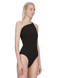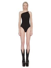 RICK OWENS SS24 LIDO TWIST BATHER IN BLACK STRETCH NYLON JERSEY THIS TWIST BATHER IS A SKINTIGHT, ONE PIECE, SWIMSUIT. IT HAS ONE LEFT SHOULDER WITH AN ASYMMETRICAL NECKLINE AND A TWIST ON THE RIGHT SHOULDER CREATING DRAPING ACROSS THE CHEST. IT HAS THE SIGNATURE CENTRE BACK SEAM RUNNING DOWN THE SPINE THIS MEDIUMWEIGHT CLASSIC SWIMWEAR JERSEY HAS COMFORT STRETCH, A MATTE FINISH AND IS PRODUCED ESPECIALLY FOR SWIMWEAR WITH HIGH UV AND CHLORINE RESISTANCE. IT IS MADE USING ECONYL® RECYCLED POLYAMIDE, MADE FROM 100% WASTE MATERIAL THAT WOULD OTHERWISE POLLUTE THE EARTH. - COLOR: BLACK - MATERIAL: 73% NYLON + 27% ELASTANE - MODEL IS 181CM TALL - MODEL WEARS SIZE 40