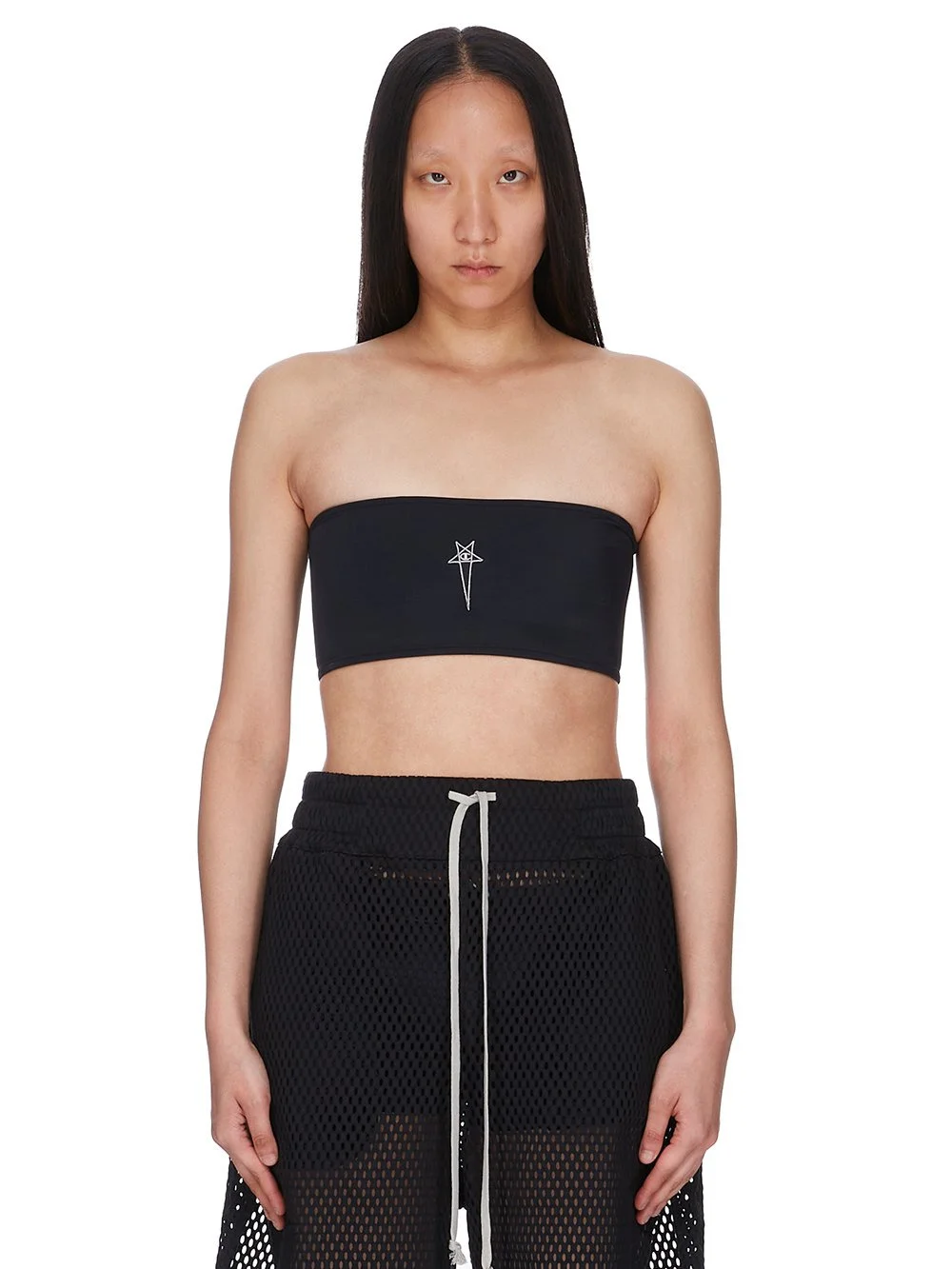 CHAMPION X RICK OWENS SS25 BRA IN BLACK SWIM JERSEY THIS BRA IS A STRAPLESS TUBE TOP THAT COVERS THE BUST. IT FEATURES A 3D CHAMPION X RICK OWENS PENTAGRAM LOGO PATCH ON RIGHT FRONT. THIS MEDIUMWEIGHT CLASSIC SWIMWEAR JERSEY HAS COMFORT STRETCH, A MATTE FINISH AND IS PRODUCED ESPECIALLY FOR SWIMWEAR WITH HIGH UV AND CHLORINE RESISTANCE. THIS JERSEY IS MADE USING CERTIFIED RECYCLED POLYAMIDE WHICH ENSURES A REDUCTION IN WATER CONSUMPTION, EMISSIONS AND HAZARDOUS WASTE, LESSENING THE DEPENDENCE ON NON-RENEWABLE RESOURCES. COLOR: BLACK MATERIAL: 80% POLYAMIDE 20% ELASTANE MODEL WEARS SIZE S MODEL IS 181CM TALL