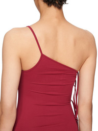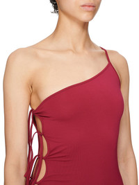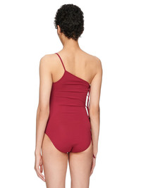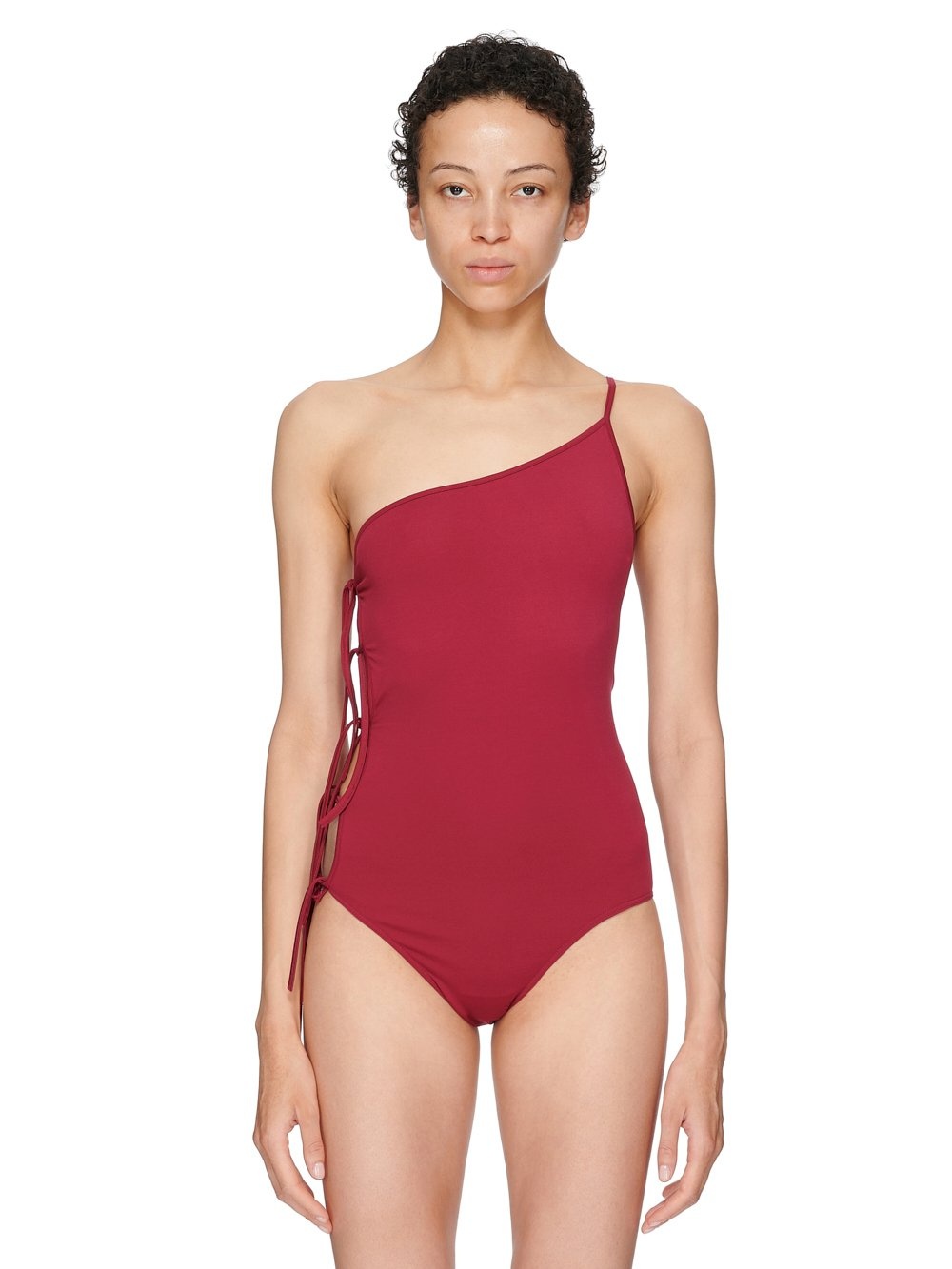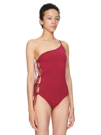 RICK OWENS SS23 EDFU TACO BATHER IN FUCHSIA RECYCLED NYLON SWIMWEAR JERSEY THIS TACO BATHER IS A SKIN TIGHT ONE PIECE SWIMSUIT. IT HAS AN ASYMMETRICAL NECKLINE WITH ONE THIN SHOULDER STRAP, AND FEATURES AN OPEN RIGHT SIDE BODY THAT CLOSES WITH THIN ADJUSTABLE TIES THIS MEDIUMWEIGHT CLASSIC SPORT JERSEY HAS COMFORT STRETCH, A MATTE FINISH AND IS PRODUCED ESPECIALLY FOR SWIMWEAR WITH HIGH UV AND CHLORINE RESISTANCE. WE CHOSE TO MAKE THIS PRODUCT FROM CERTIFIED RECYCLED POLYAMIDE BECAUSE IT ENSURES A REDUCTION IN WATER CONSUMPTION, EMISSIONS AND HAZARDOUS WASTE, LESSENING THE DEPENDENCE ON NON-RENEWABLE RESOURCES. - COLOR: FUCHSIA - MATERIAL: 73% NYLON + 27% ELASTANE - MODEL IS WEARING SIZE 40 - MODEL IS 181 CM TALL