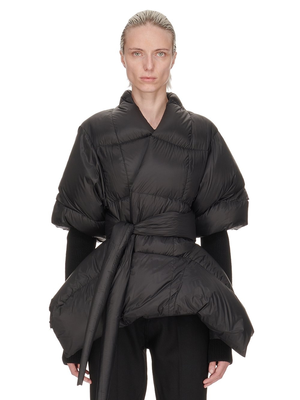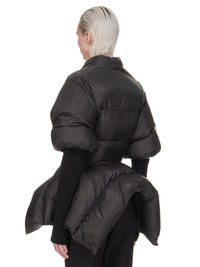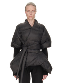 RICK OWENS FW24 PORTERVILLE BATWING DUVET IN BLACK RECYCLED NYLON THIS BATWING DUVET IS HIP-LENGTH WITH A PEAKED HEMLINE AND NASKA BACK, CURVING INTO TWO POINTS. IT HAS A KIMONO NECKLINE, WRAPS OVER THE CHEST AND SECURES WITH A WIDE DUVET TIE. IT HAS DUVET SLEEVES TO THE ELBOW, AND A LONG KNIT SLEEVE AT THE LOWER ARM. IT FEATURES WIDE HORIZONTAL AND DIAGONAL DUVET STITCHING LINES THIS AIRY AND LIGHTWEIGHT NYLON IS MADE USING GRS CERTIFIED RECYCLED NYLON WHICH ENSURES A REDUCTION IN WATER CONSUMPTION, EMISSIONS AND HAZARDOUS WASTE, LESSENING THE DEPENDENCE ON NON-RENEWABLE RESOURCES - COLOR: BLACK - MATERIAL: 100% NYLON - KNIT RIB ARM WARMERS 87% CASHMERE + 7% NYLON + 3% WOOL + 3% ELASTANE - PADDING 90% GOOSE DOWN + 10% MAL - MODEL IS 181CM TALL - MODEL WEARS SIZE 40