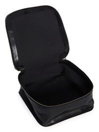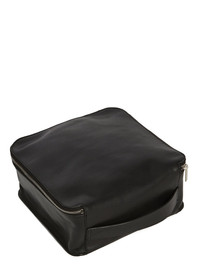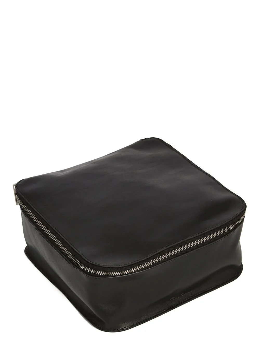 RICK OWENS LARGE BEAUTY CASE IN BLACK COW LEATHER THIS RICK OWENS LARGE BEAUTY CASE IS A DEEP, SQUARE LEATHER CASE WITH A ZIPPER AROUND THREE OF THE TOP EDGES. IT HAS A LEATHER CARRYING STRAP ATTACHED TO THE BACKSIDE AND A ZIPPER ENGRAVED WITH THE RICK OWENS LOGO IT MEASURES 21CM X 21CM X 9CM COLOR: BLACK MATERIAL: 100% COW LEATHER