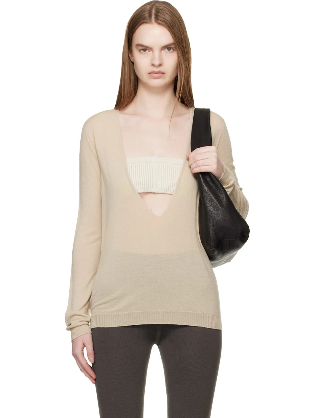 Beige Temple Extreme V Neck Pull Sweater
