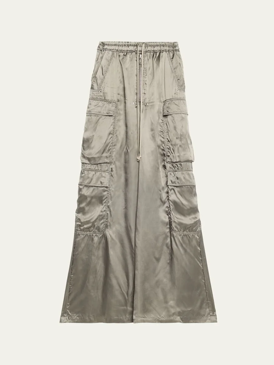 Crafted from lustrous cupro satin, the "Belas" cargo pants from Rick Owens feature a drawstring waistband and relaxed, wide legs adorned with double flap patch pockets Mid rise sits high on hip Angled side slip pockets Back welt pockets Side leg flap cargo pockets Wide legs Full length Pullon style Cupro Hand wash Made in Italy SIZE amp; FITModel measurements: 5'10" tall Model is wearing a US size 4/Small