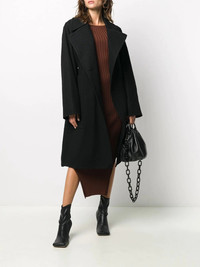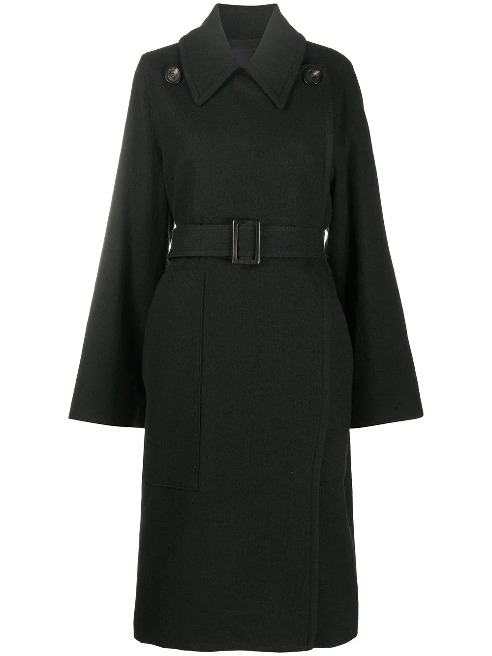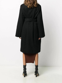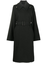 belted military-inspired coat Highlights - Black - Cotton-wool blend - Classic collar - Front button fastening - Belted waist - Front patch pocket - Long sleeves Made in Italy Composition Outer: Buffalo Horn 100%, Cotton 52%, Wool 48% Lining: Cotton 100%, Viscose 53%, Cupro 47% SIZE & FIT Model measurements Height 5 ft 9 in(1.75 m) Bust/Chest 32.67 in(83 cm) Hips 36.22 in(92 cm) Waist 24.8 in(63 cm) Measurement SLEEVE LENGTH 24.4 in(62 cm) LENGTH 41.33 in(105 cm) BUST 48.42 in(123 cm) FittingInformation This piece fits true to size. We recommend you get your regular size Cut for a loose fit. Comes with an adjustable belt for a flexible fit at the waist Made with a mid-weight non-stretch fabric Washing instructions Dry Clean Only