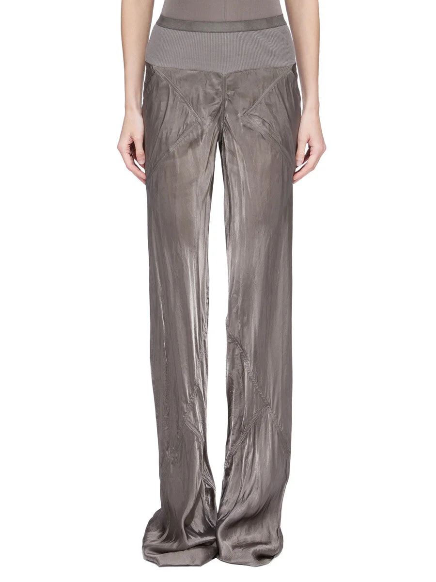 RICK OWENS SS26 TEMPLE BIAS IN DUST CUPRO SATIN THESE BIAS PANTS ARE FLOOR-LENGTH, THEY ARE LOOSE FITTING AND BIAS CUT, WITH DIAGONAL BIAS SEAMS TRACING AROUND THE LEGS. THEY HAVE SQUARE SIDE POCKETS, AN ELASTICIZED, RIBBED WAISTBAND RAW CUT HEMS. THIS LIGHTWEIGHT AND FLUID CUPRO SATIN HAS A GLOSSY SURFACE, A SOFT HANDFEEL AND WASHED FINISH. THIS FABRIC IS MADE USING CUPRO WHICH IS BIODEGRADABLE AND 100% PLANT BASED. AS IT’S MADE FROM COTTON WASTE, CUPRO HELPS FIND A PURPOSE TO FIBERS THAT WOULD OTHERWISE BE DISCARDED. COLOR: DUST MATERIAL:100% CUPRO BAND 65% COTTON + 35% NYLON MODEL IS 181CM TALL MODEL WEARS SIZE 40