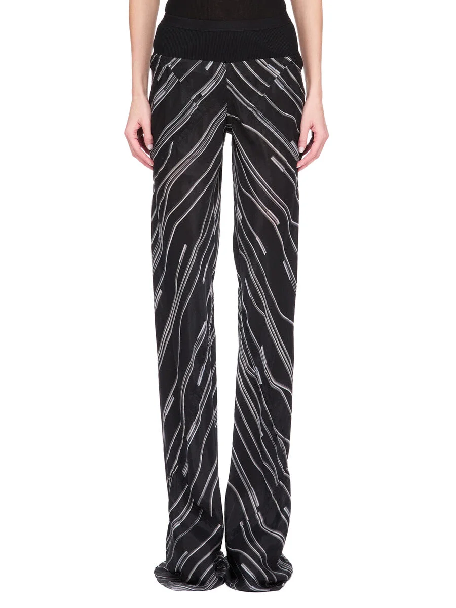 RICK OWENS FW25 CONCORDIANS BIAS IN PRINTED CUPRO JAPONETTE THESE BIAS PANTS ARE FLOOR-LENGTH, THEY ARE LOOSE FITTING AND BIAS CUT, WITH DIAGONAL BIAS SEAMS TRACING AROUND THE LEGS. THEY HAVE SQUARE SIDE POCKETS, A ELASTIC AND RIBBING WAISTBAND RAW CUT HEMS. THIS LIGHTWEIGHT AND FLUID JAPONETTE HAS A COOL HANDFEEL AND IS DIGITALLY PRINTED WITH OUR SEASONAL SNAKE CHAIN MOTIF. THIS FABRIC IS MADE USING CUPRO WHICH IS BIODEGRADABLE AND 100% PLANT BASED. AS IT’S MADE FROM COTTON WASTE, CUPRO HELPS FIND A PURPOSE TO FIBERS THAT WOULD OTHERWISE BE DISCARDED. COLOR: BLACK/PEARL MATERIAL: 100% CUPRO MODEL IS 181CM TALL MODEL WEARS SIZE 40