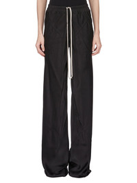 RICK OWENS FW25 CONCORDIANS DRAWSTRING BIAS IN BLACK WASHED CHARMEUSE THESE DRAWSTRING BIAS PANTS ARE FLOOR-LENGTH WITH A LOOSE FIT. THEY ARE BIAS CUT WITH DIAGONAL SEAMS TRACING AROUND THE LEGS. THEY HAVE SQUARE SIDE POCKETS, AN ELASTIC AND RIBBING WAISTBAND RAW CUT HEMS THIS LIGHTWEIGHT AND FLUID CHARMEUSE HAS A SEMI-SHINY SURFACE AND WASHED FINISH THIS FABRIC IS MADE FROM FSC® CERTIFIED VISCOSE WHICH ENSURES THAT THE FIBERS ARE PRODUCED FROM RESPONSIBLY MANAGED SOURCES AND NO DEFORESTATION OCCURS COLOR: BLACK MATERIAL: 61% ACETATE + 39% VISCOSE MODEL IS 181CM TALL MODEL WEARS SIZE 40