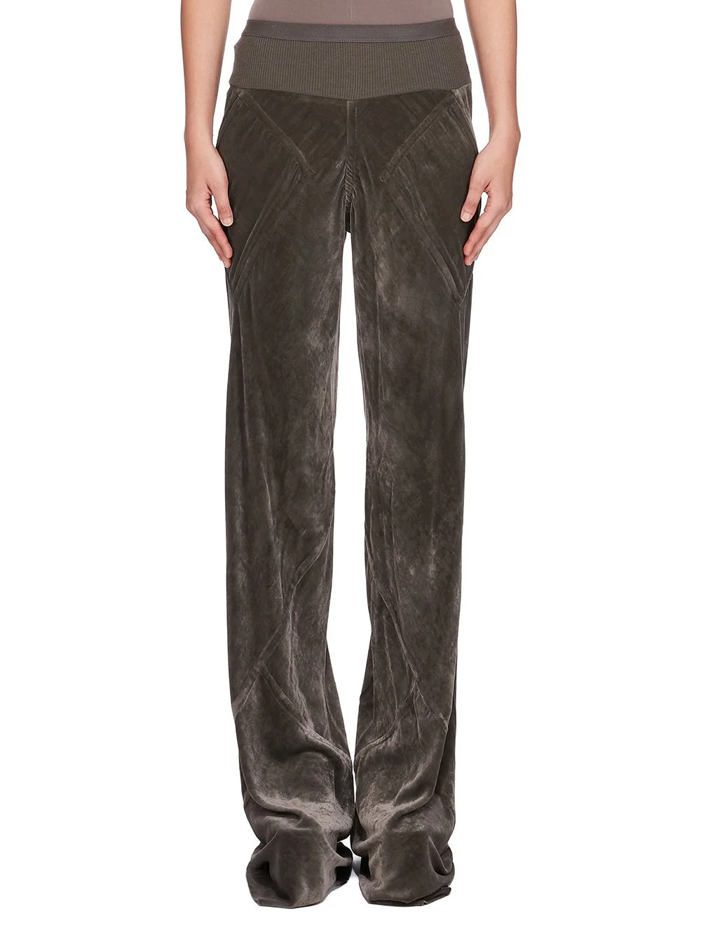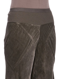 RICK OWENS FW25 CONCORDIANS BIAS IN BOSCO VELVET THESE BIAS PANTS ARE FLOOR-LENGTH, THEY ARE LOOSE FITTING AND BIAS CUT, WITH DIAGONAL BIAS SEAMS TRACING AROUND THE LEGS. THEY HAVE SQUARE SIDE POCKETS, A ELASTIC AND RIBBING WAISTBAND RAW CUT HEMS THIS LIGHTWEIGHT AND FLUID VELVET HAS A SOFT AND WASHED UNEVEN FINISH THIS FABRIC IS MADE FROM FSC® CERTIFIED VISCOSE WHICH ENSURES THAT THE FIBERS ARE PRODUCED FROM RESPONSIBLY MANAGED SOURCES AND NO DEFORESTATION OCCURS COLOR: BOSCO MATERIAL: 82% VISCOSE + 18% SILK BAND 65% COTTON + 35% NYLON MODEL IS 181CM TALL MODEL WEARS SIZE 40